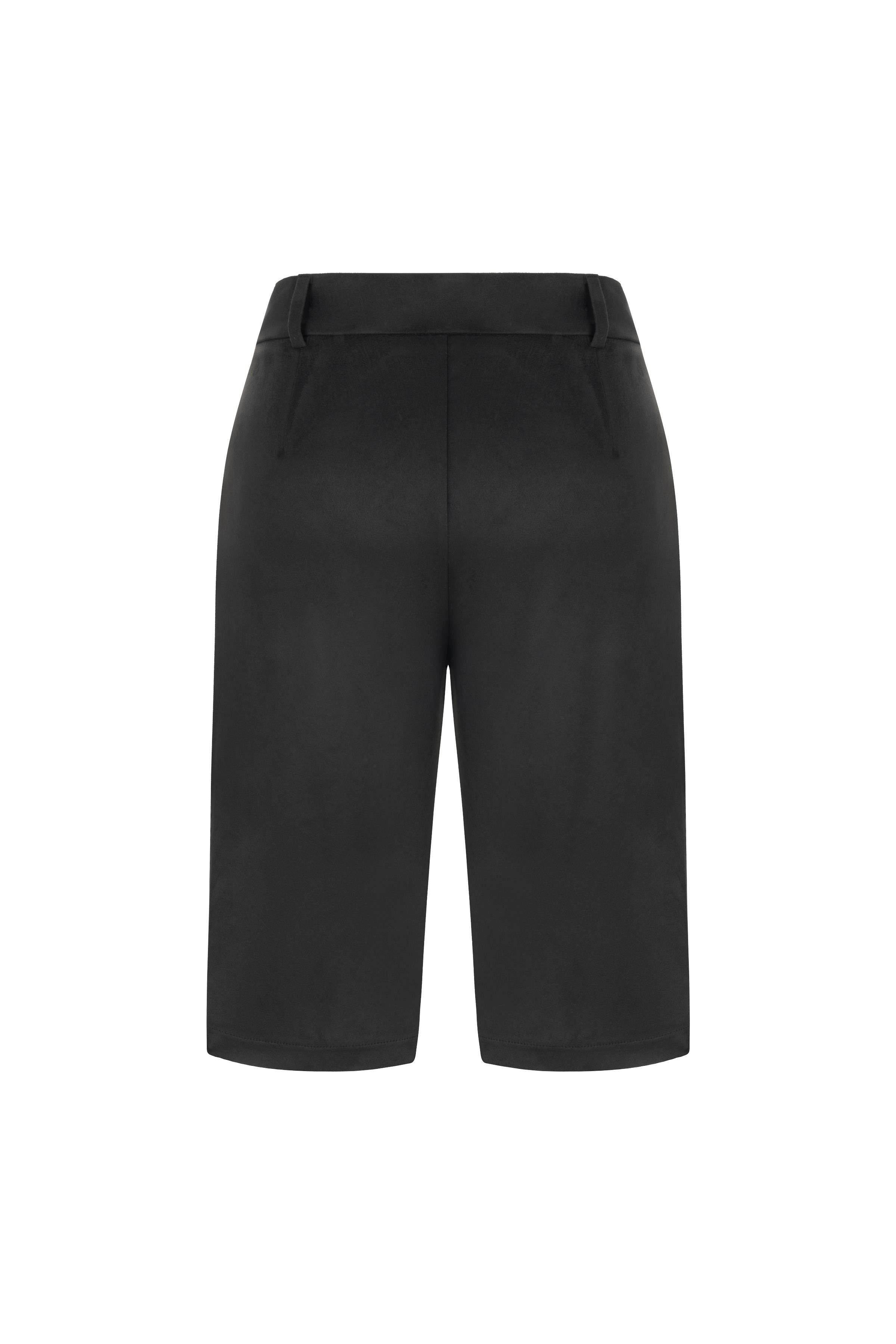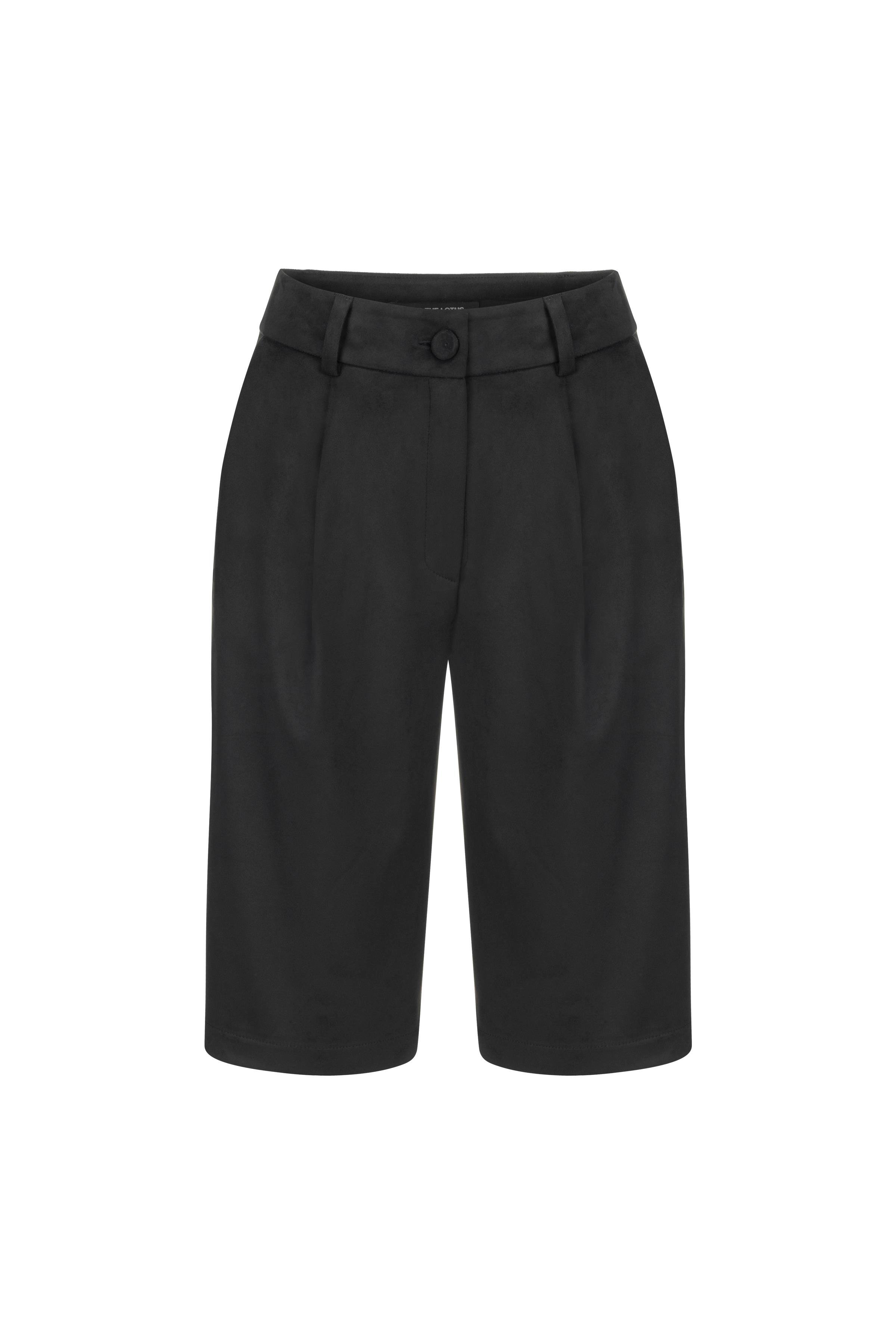 The knee-length shorts feature pleat detailing, a high waist with a belted design, and convenient side pockets.