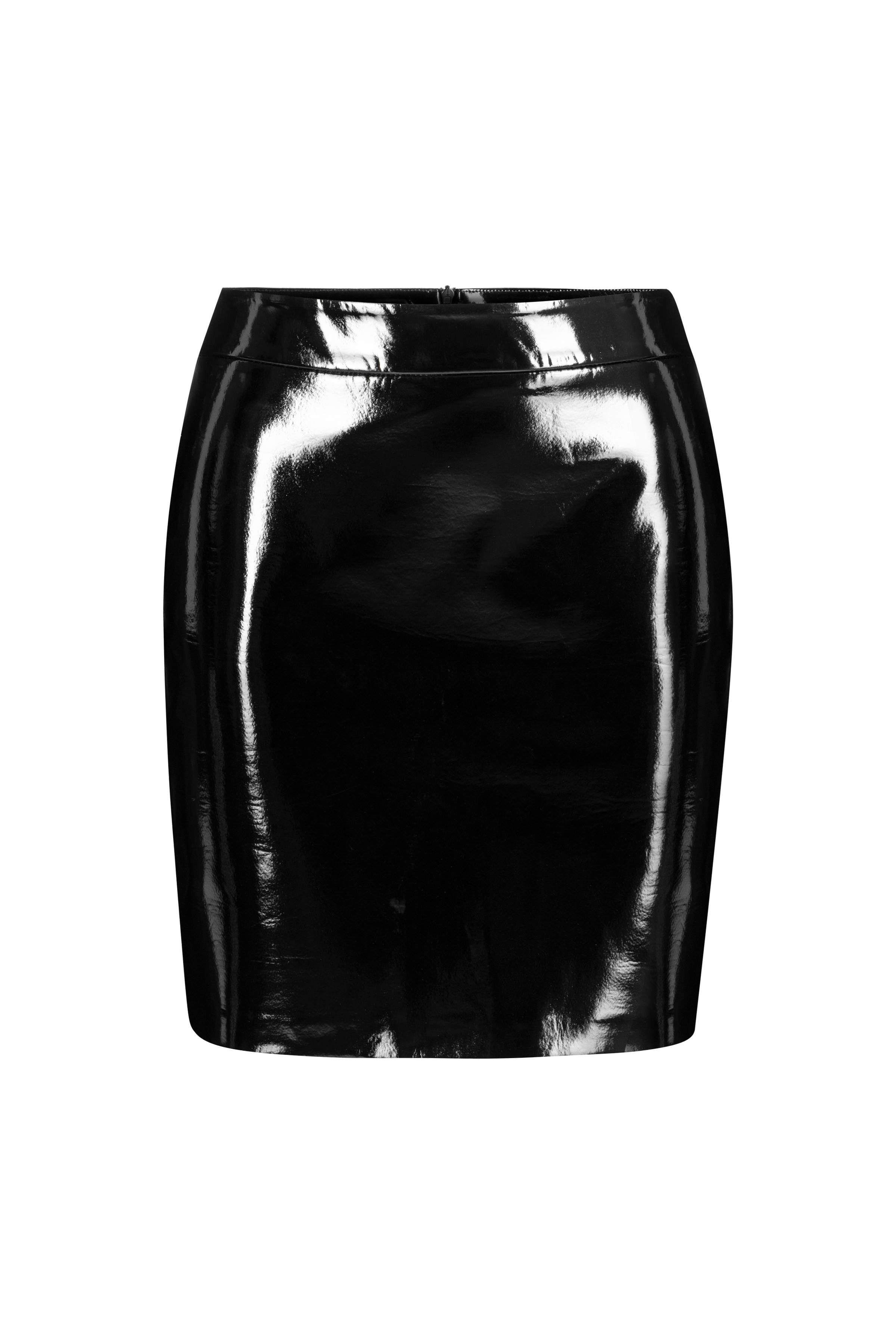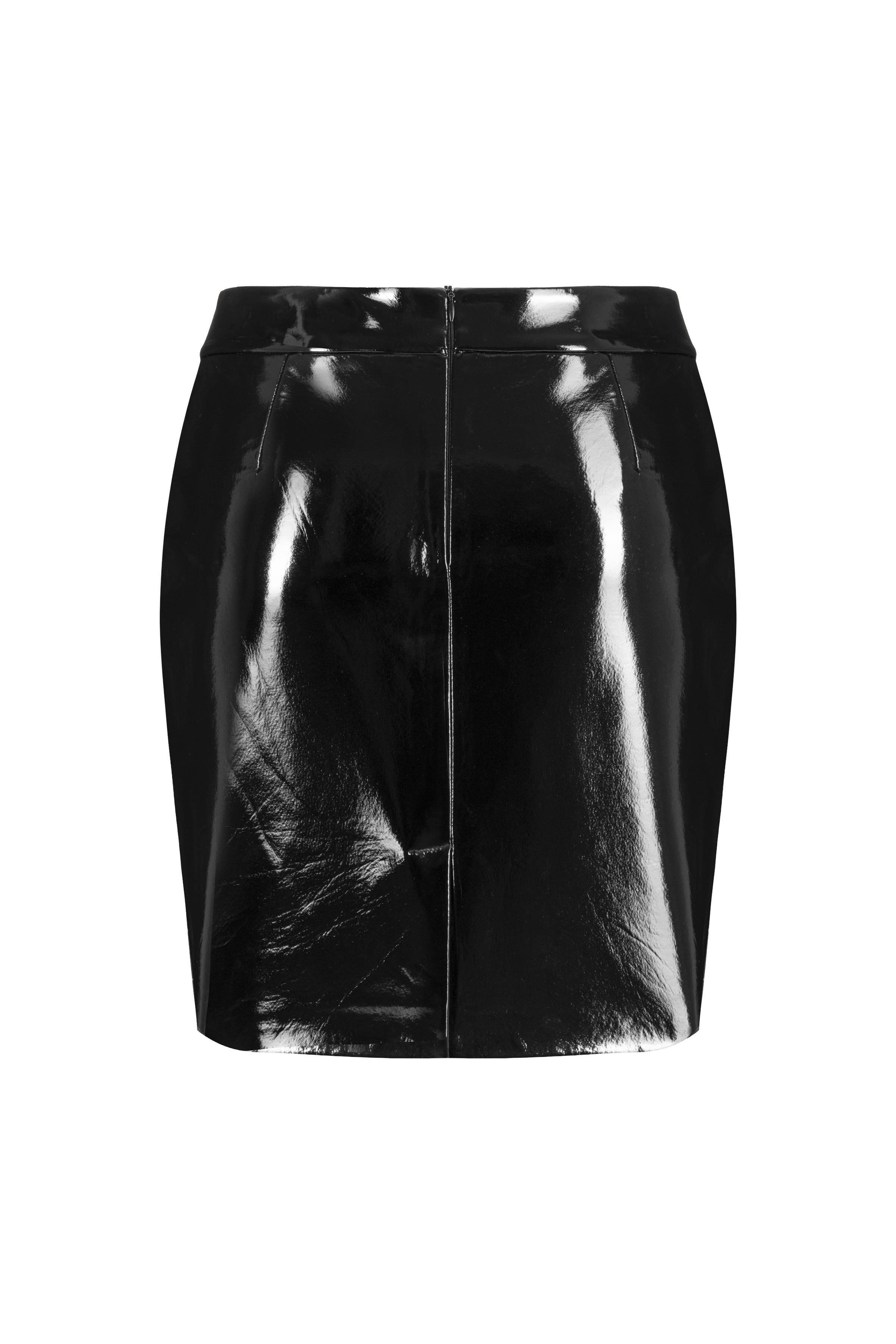 A well-fitted sculptural mini skirt crafted from faux patent leather.
