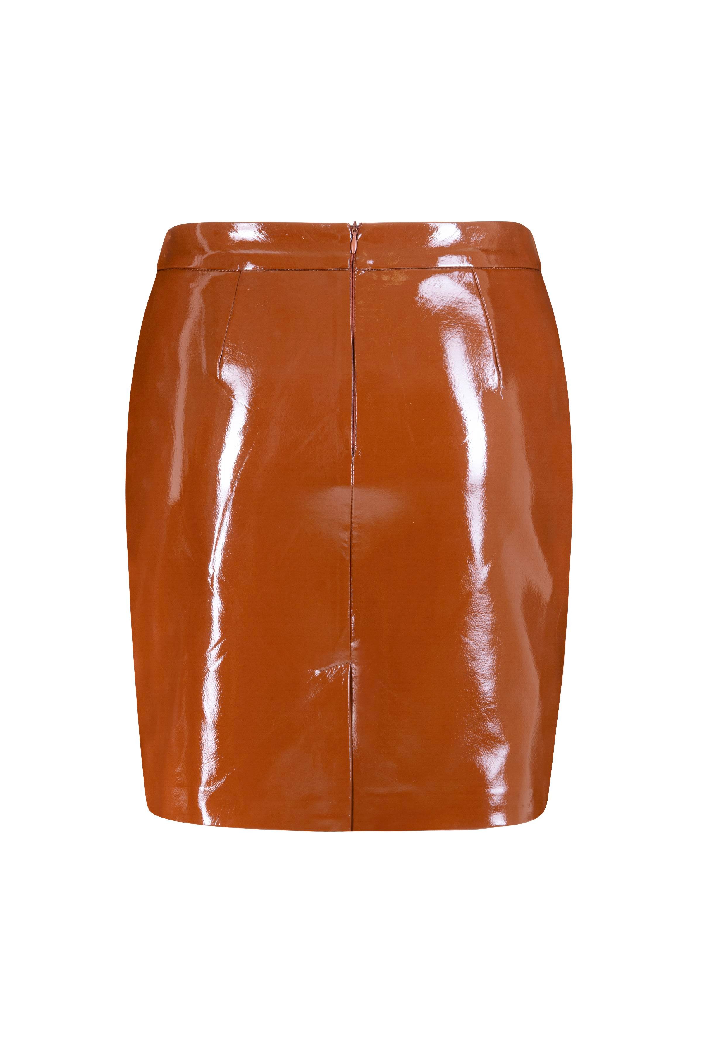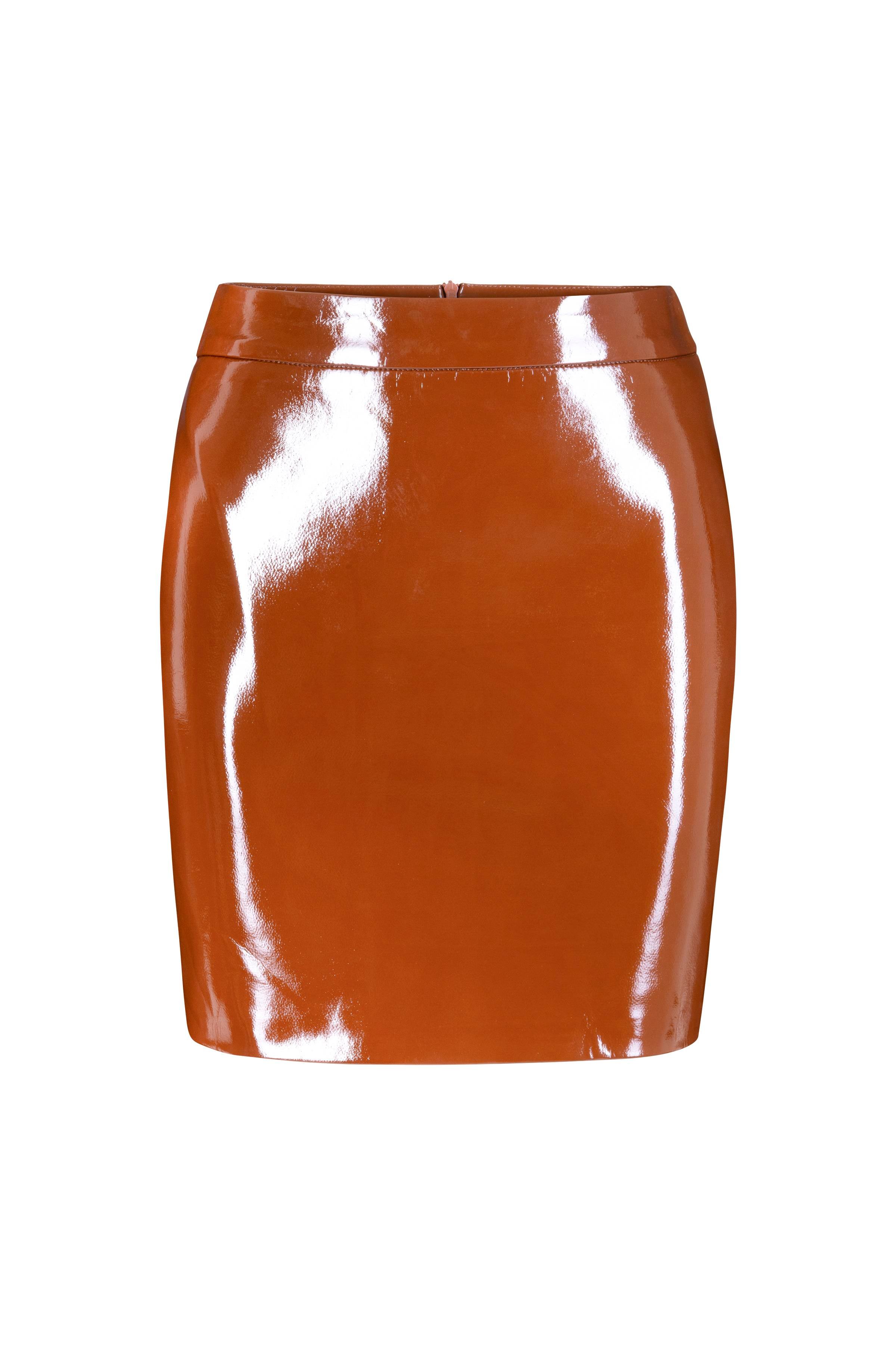 A well-fitted sculptural mini skirt crafted from faux patent leather.