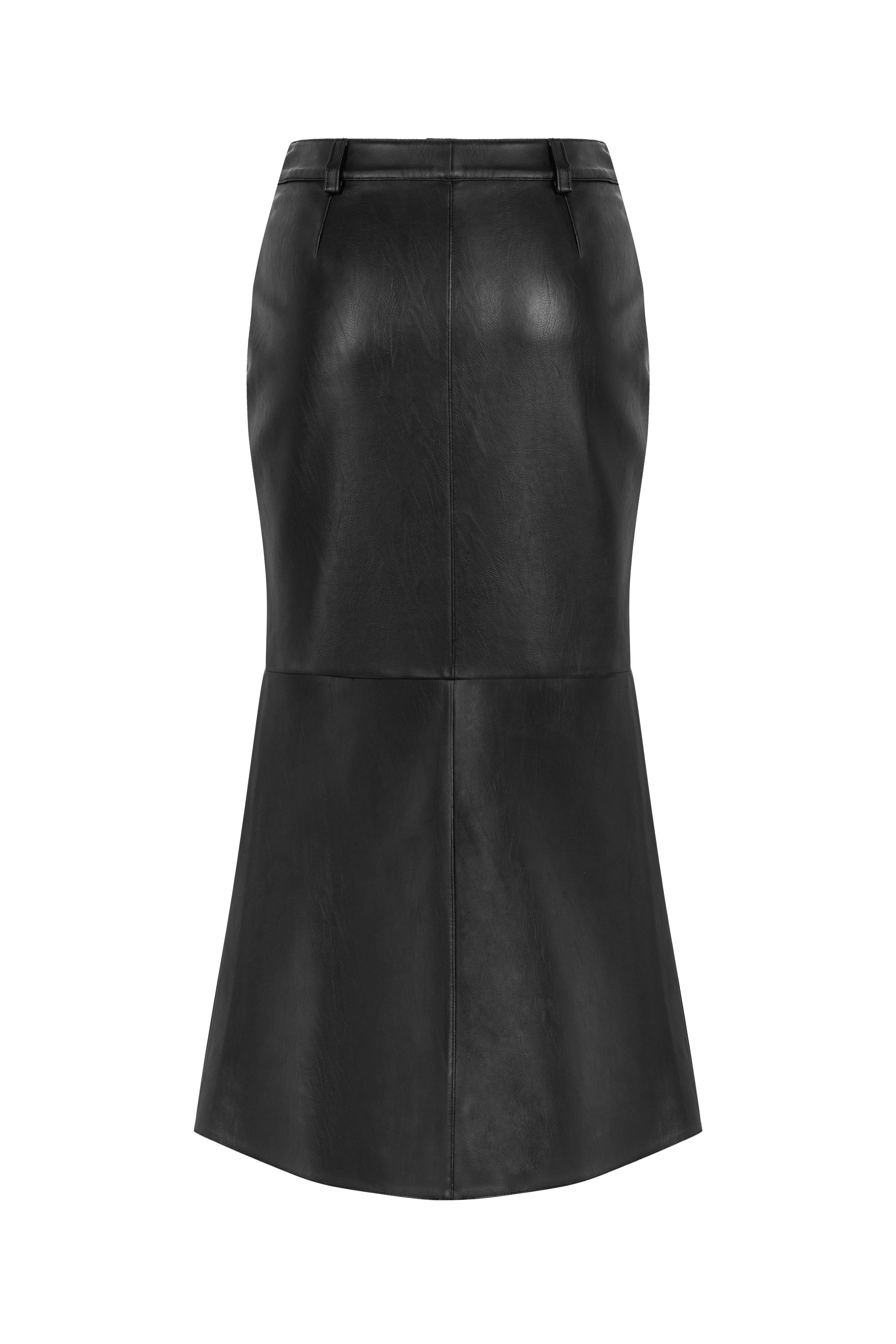 Marina midi-length skirt is crafted from faux leather, featuring a high rise, zipper fly with button fastening, and pockets on both sides.
