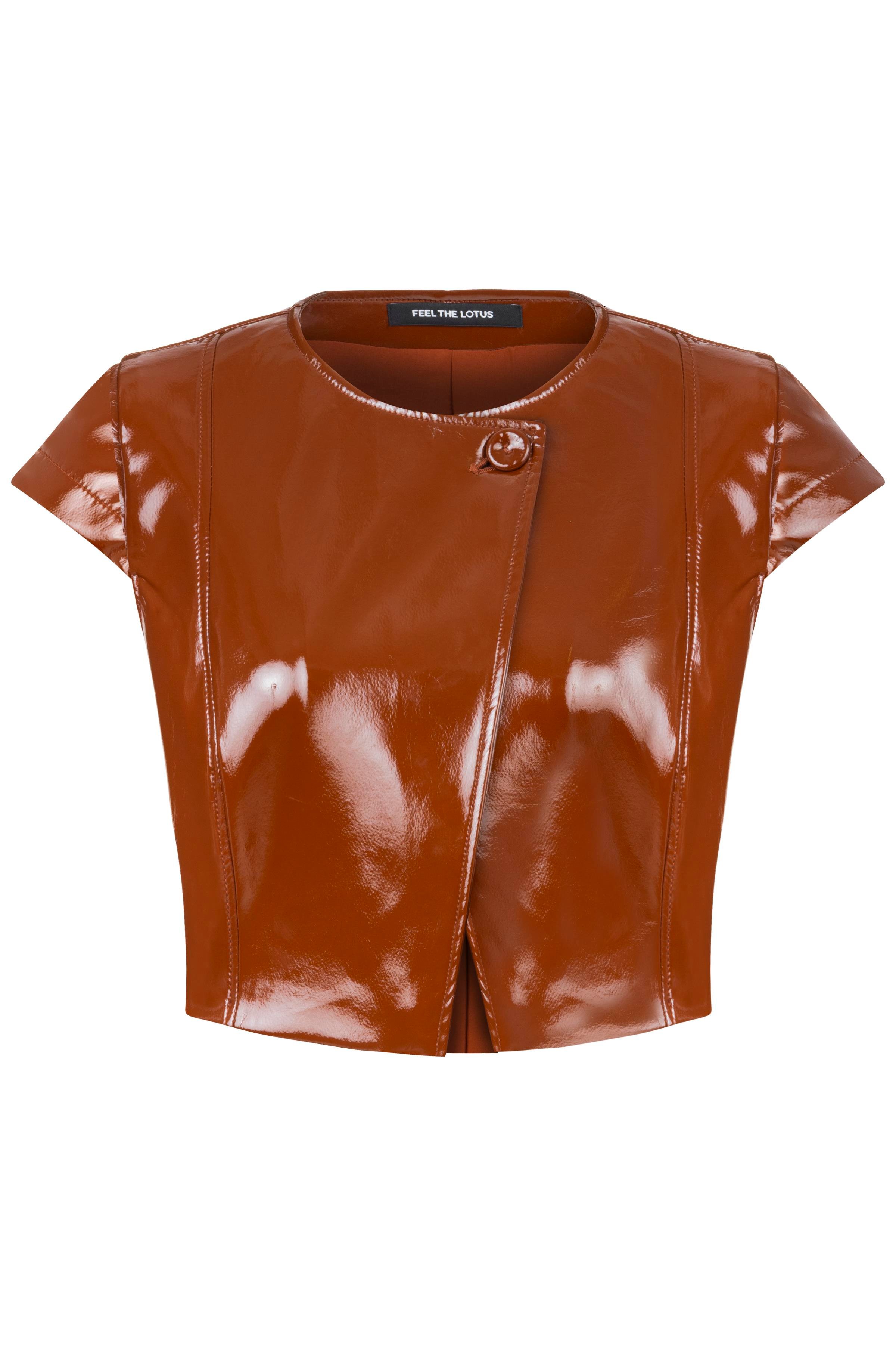 Millie top features a cropped half-sleeve design with front button detailing, crafted from faux patent leather.