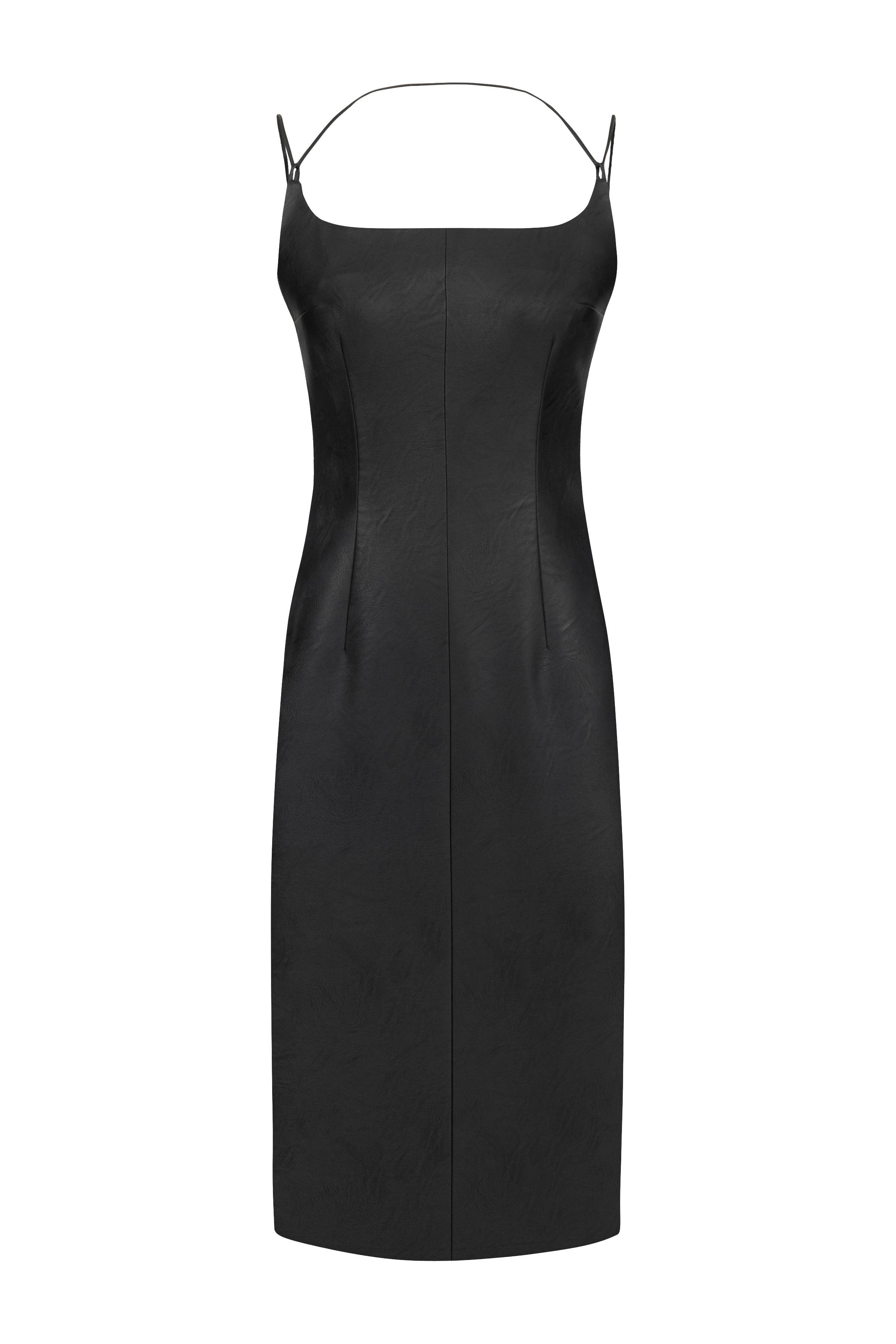 Valentina black faux leather halterneck midi dress features a form-fitting silhouette, slender shoulder straps, and a split at the back.